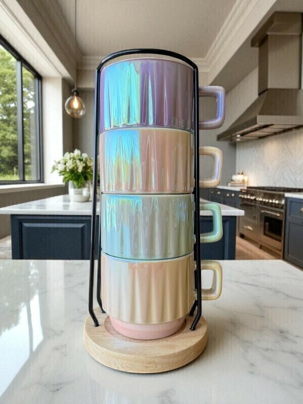 Colores pasteles con efecto tornasolado que nos transportan al verano eterno de la costa italiana. Este set x4 de tazas de cerámica con base de madera y organizador metálico es una joya funcional que ilumina cualquier espacio. Liviano, brillante y lleno de estilo. 💫☕🌈